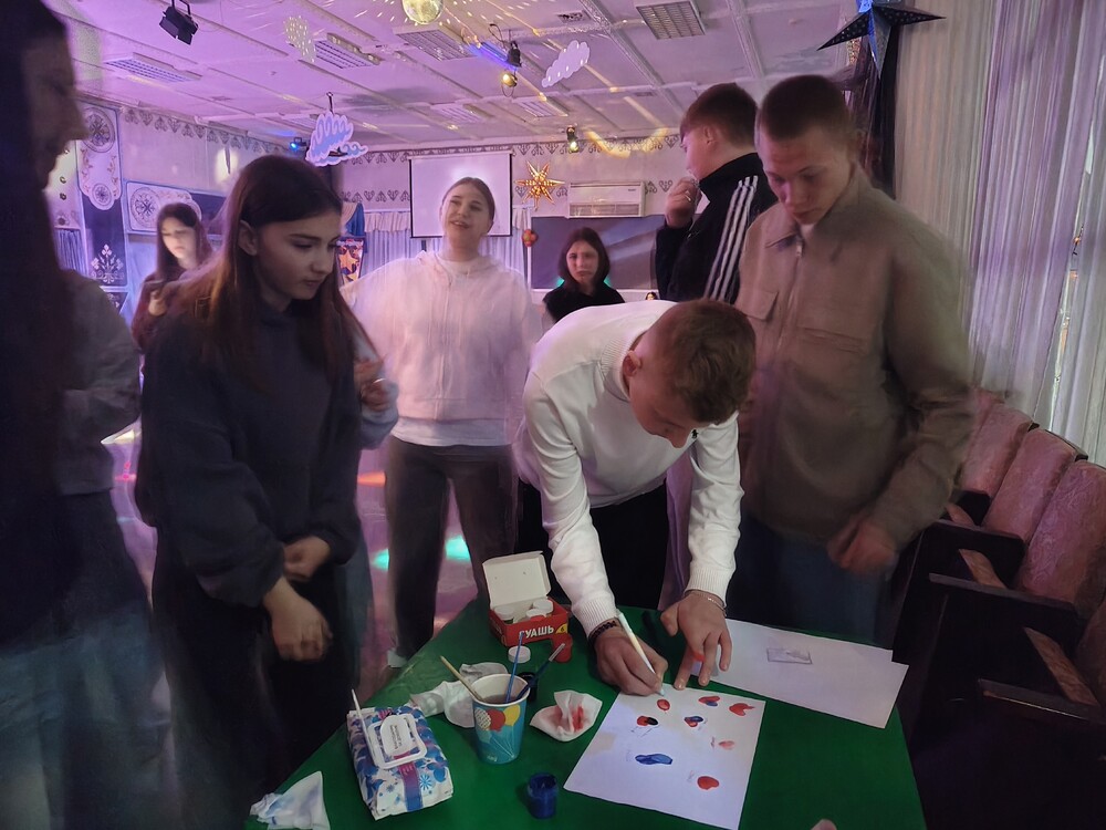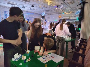 Участники соревновались в логике и скорости, собирая стаканчики по символам, а также проявляли творчество, создавая общее сердце из отпечатков пальцев и оставляя добрые слова в «шляпе пожеланий».