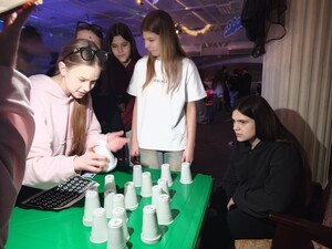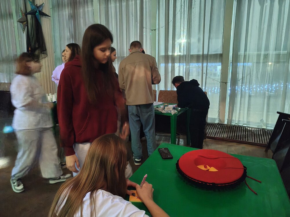 Участники соревновались в логике и скорости, собирая стаканчики по символам, а также проявляли творчество, создавая общее сердце из отпечатков пальцев и оставляя добрые слова в «шляпе пожеланий».