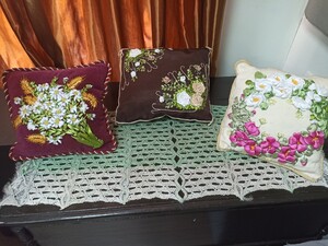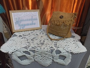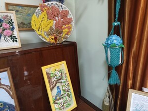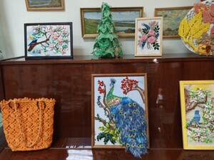 Здесь можно увидеть картины с цветами и словно живыми птицами, сумочки из капроновой нити и джута, кашпо, декоративные подушки с цветами из лент - настоящие произведения искусства.