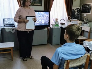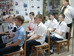Ребята посмотрели видеоролики, подготовленные музеем в рамках проекта "Пусть поколения помнят" - "Без вести пропавшим посвящается", "Памяти сожженных деревень". Узнали о причинах Великой Отечественной войны, о том, какие потери понес в результате Советский Союз - 26,6 млн. человек.
