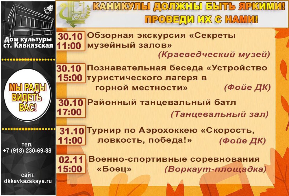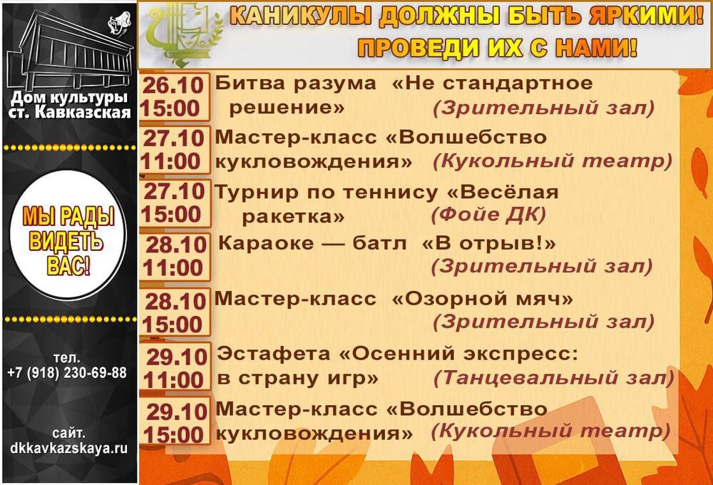 пн, 27.10.2025 - 09:58 Наши мероприятия Осенние каникулы - это не повод скучать дома! Дом культуры станицы Кавказской приглашает ребят провести этот время весело, интересно и с пользой! Подготовил