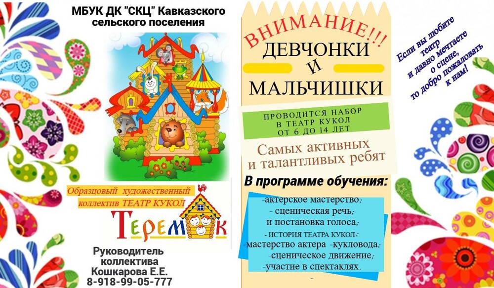 Дом культуры ст. Кавказской объявляет набор в коллектив самодеятельного искусства - образцового театра кукол «Теремок”. Участников ждут практические занятия по актёрскому мастерству, сценическому движению и речи, изготовлению кукол и бутафории под руководством руководителя театра кукол Кошкаровой Екатерины Евгениевны.